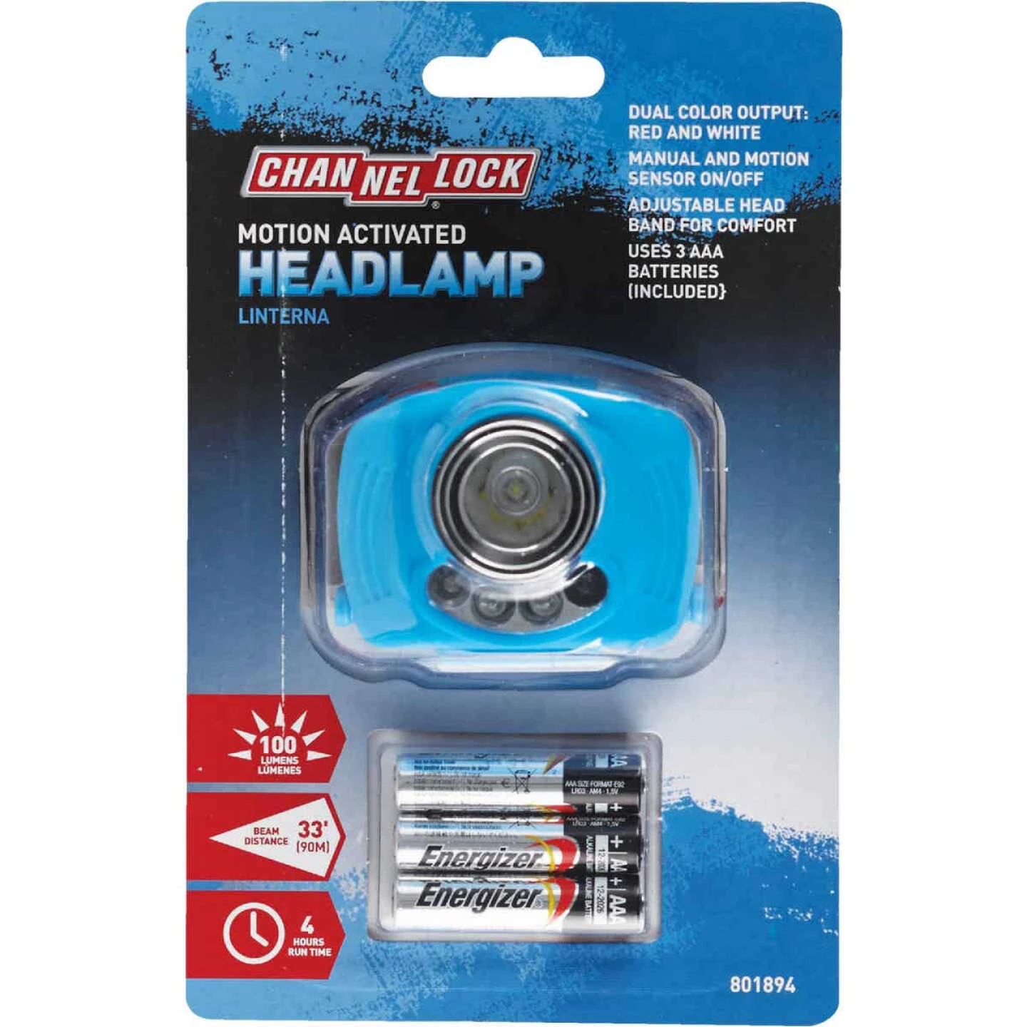 Rubber encased LED headlamp has bright white and red light settings. Manual on/off and sensor on/off setting. Expandable head band.