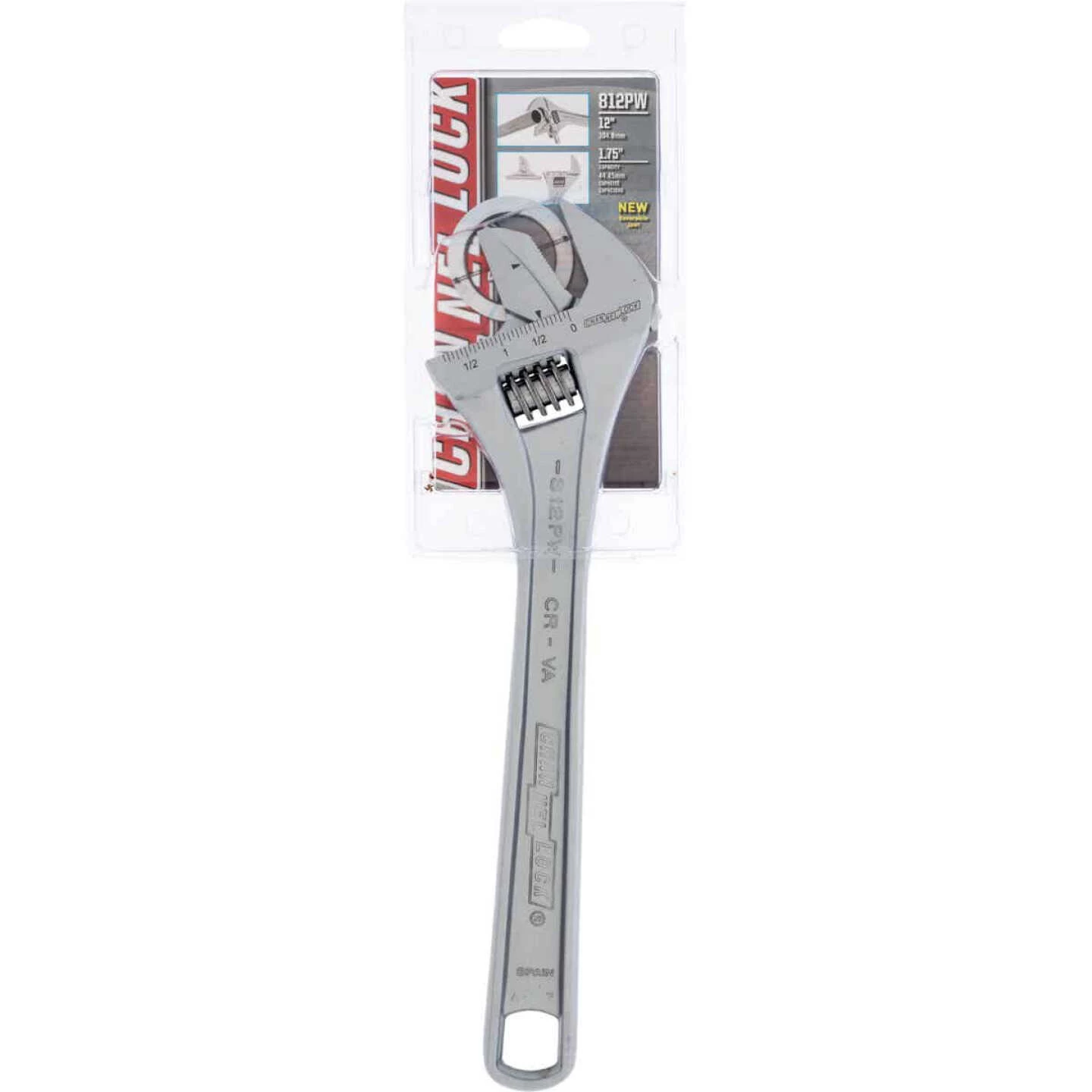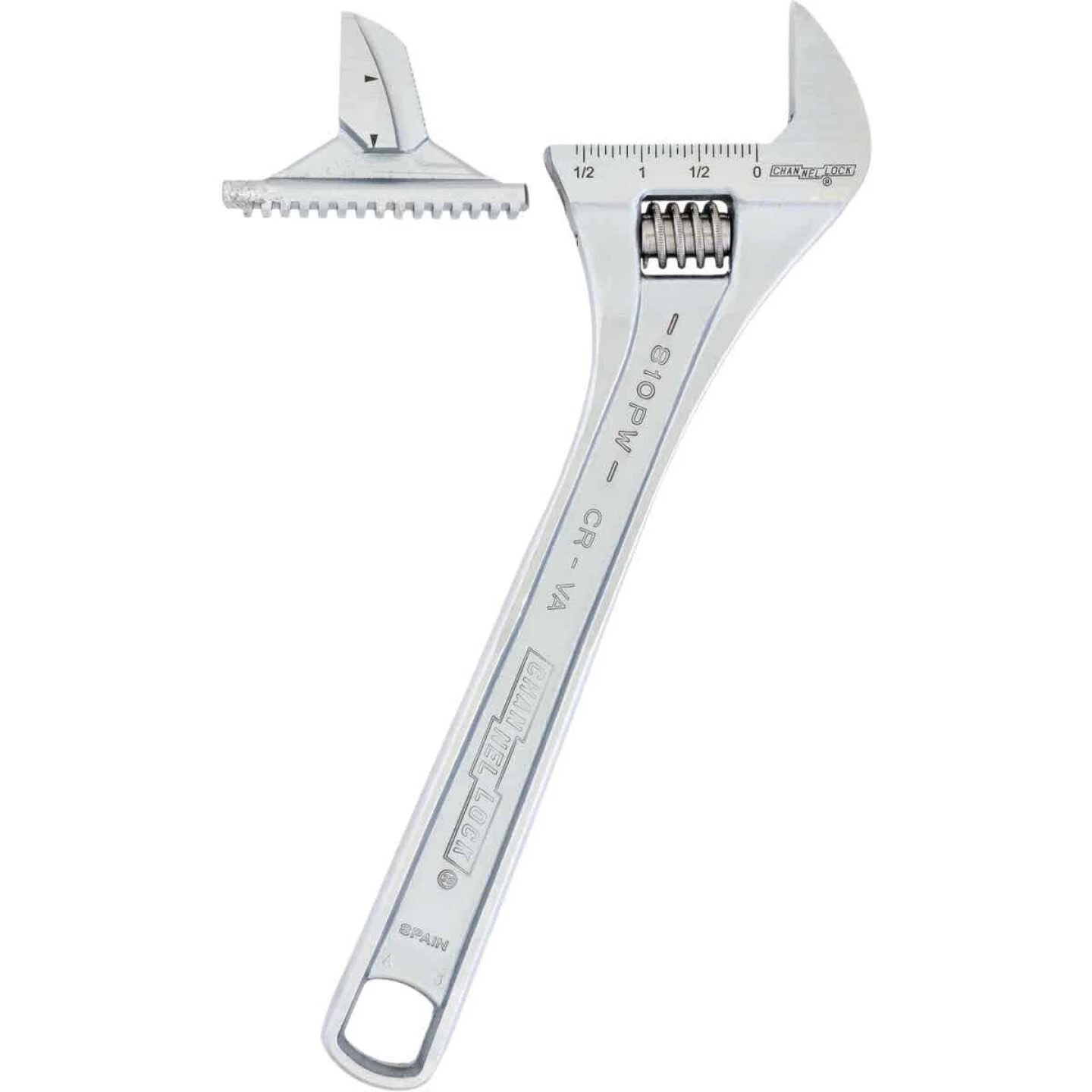 Channellock extra wide adjustable wrench features a reversible jaw for work on bolts and round stock, and greater jaw capacity supports larger nuts, bolts, and pipe. Self-gripping angled teeth grip pipe and rounded fasteners. Longer, thinner non-protruding jaws provide better grip and give greater access in tight spaces. Measurement scales (standard and metric) are convenient for sizing nuts, pipe and tube diameters. Chrome vanadium steel construction.