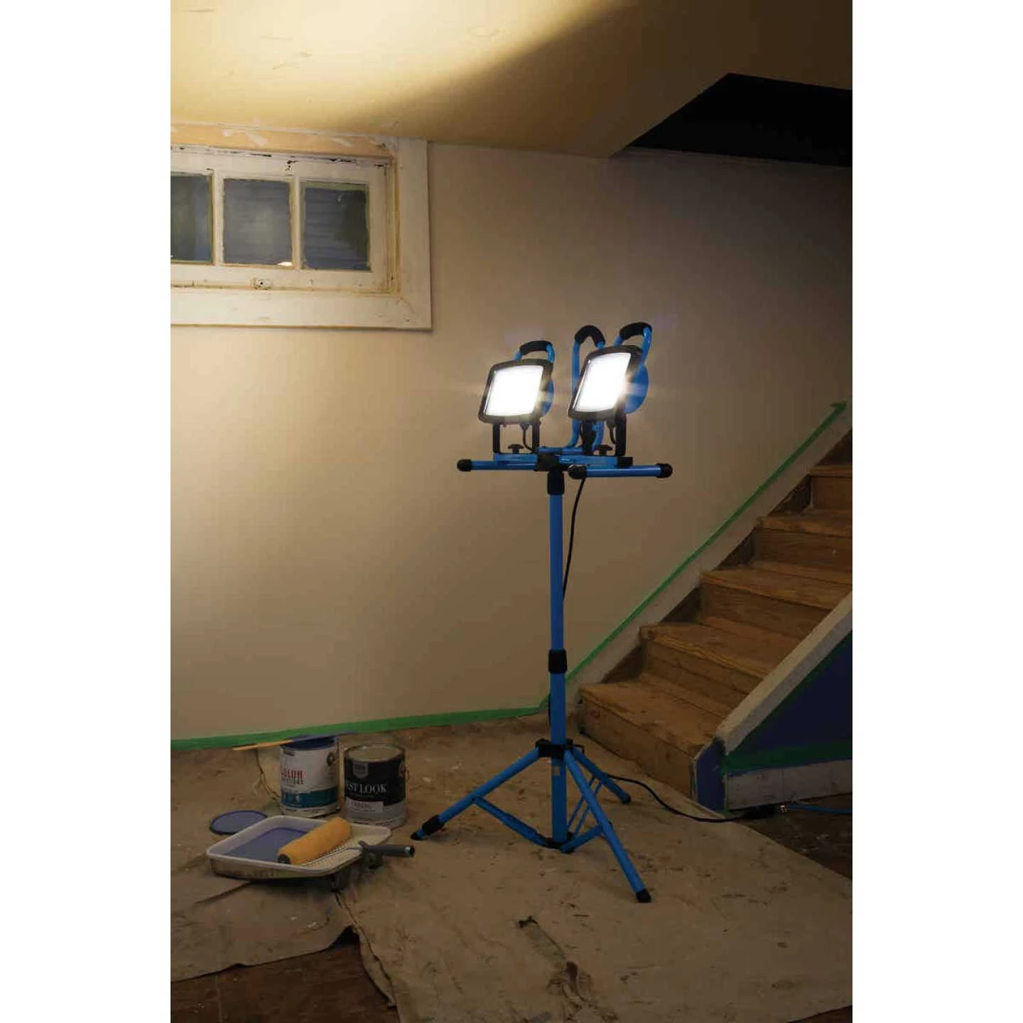 Twin head LED (light emitting diode) work light. 90 ultra bright LED bulbs per head provide 13,200-lumen output. Rugged die-cast aluminum housing with tool-free ratcheting heads that tilt up and down. Features telescoping height tripod with extension leg and quick release detachable sled. Weatherproof on/off switch and 5 Ft. grounded power cord. Lifetime limited warranty.