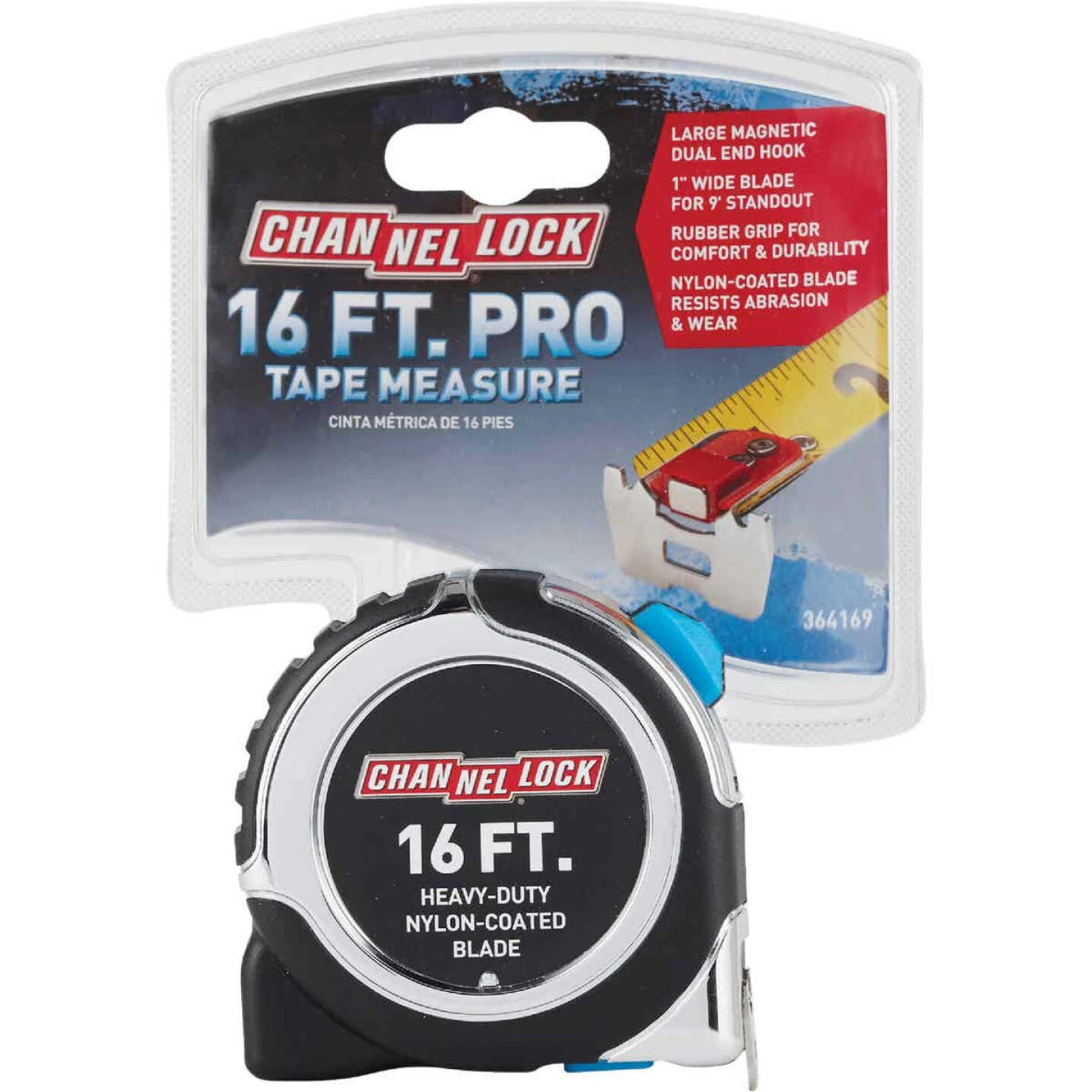 Case design fits comfortably in hand. Superior internal mechanism provides smooth operation. 2 color push-button lock with power return. Heavy-duty nylon coated blade for maximum durability. Large magnetic, flared dual end hook with 4-rivet construction. Vertically printed scale on back side of blade. Integrated belt clip on back of chrome case.