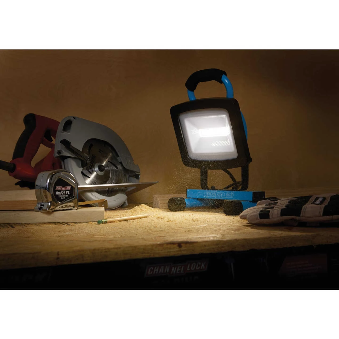 H-stand work light featuring 48 ultra-bright LED (light emitting diode) bulbs. Rugged die-cast aluminum housing with a steel H-stand and non-slip feet. Tool-free ratcheting head tilts up and down. Includes convenient carry handle for portability. Weatherproof, on/off switch, and 5-foot power cord. Lifetime limited warranty.