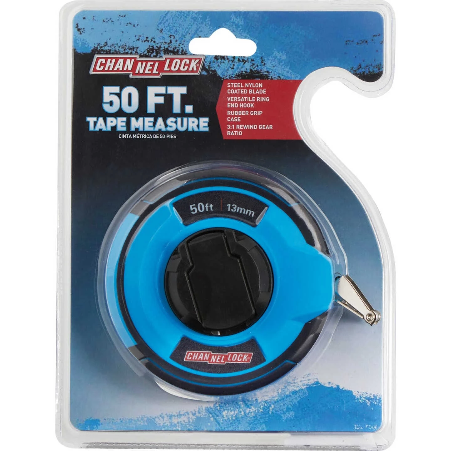 Channellock closed case steel tape measure. Features a compact rubber grip case with a folding rewind crank handle. Blade is printed in feet (one side only) and has a nylon coating for added durability. Also comes with a multi-use end hook for use in different applications.