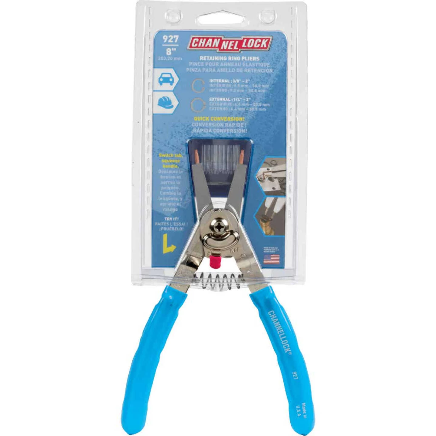 Carbon-steel pliers with corrosion-resistant black oxide finish. Quickly converts for use with either internal or external rings by a simple finger adjustment of 2 sliders. For external rings 1/2-inch to 2-inch and internal rings 3/8-inch to 2-inch. Includes 5 pairs of color-coded tips: .038 black-straight and 90-degree bend; .047 silver-straight and 90-degree bend; .070 gold-straight. Blue dipped plastic grips.
