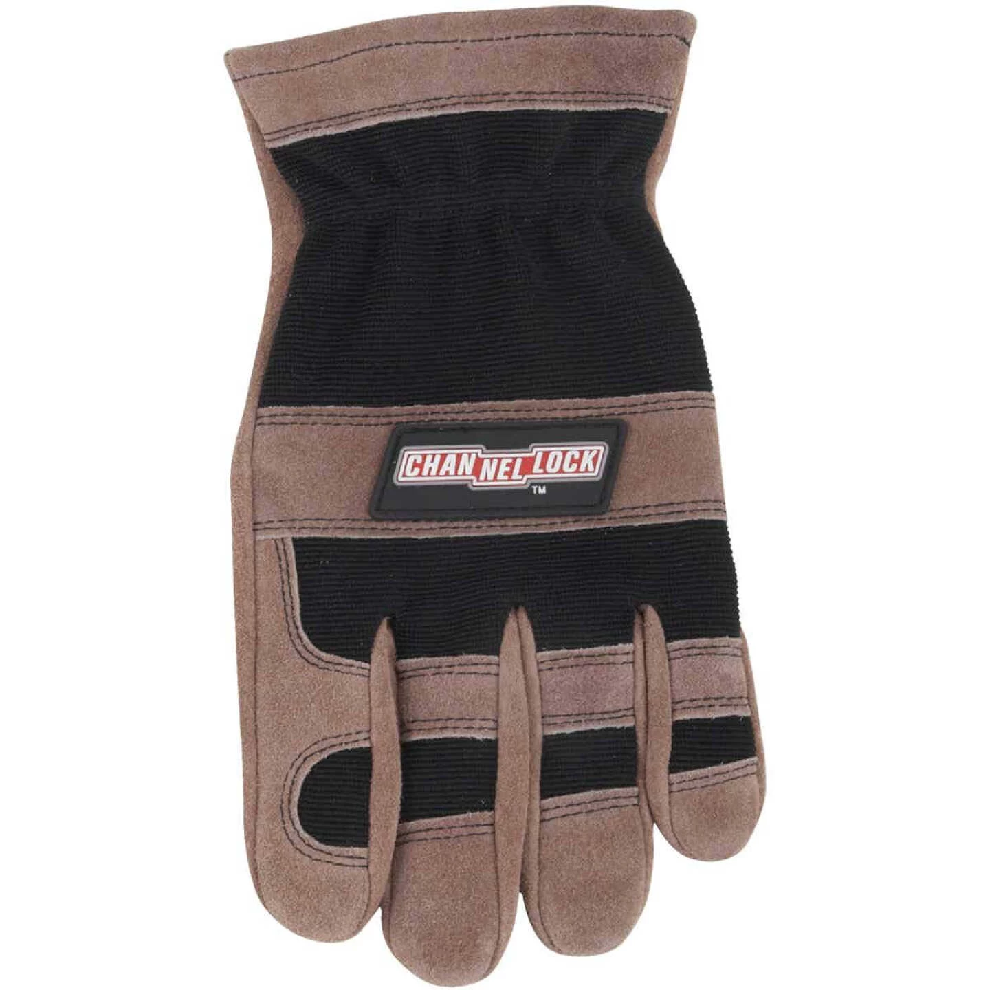 Men’s cowsplit palm work glove. Smoke color cowsplit leather palm, palm patch, finger tips, and knuckle strap back. Black color polyester spandex back. Channellock PVC badge on hand knuckle strap.