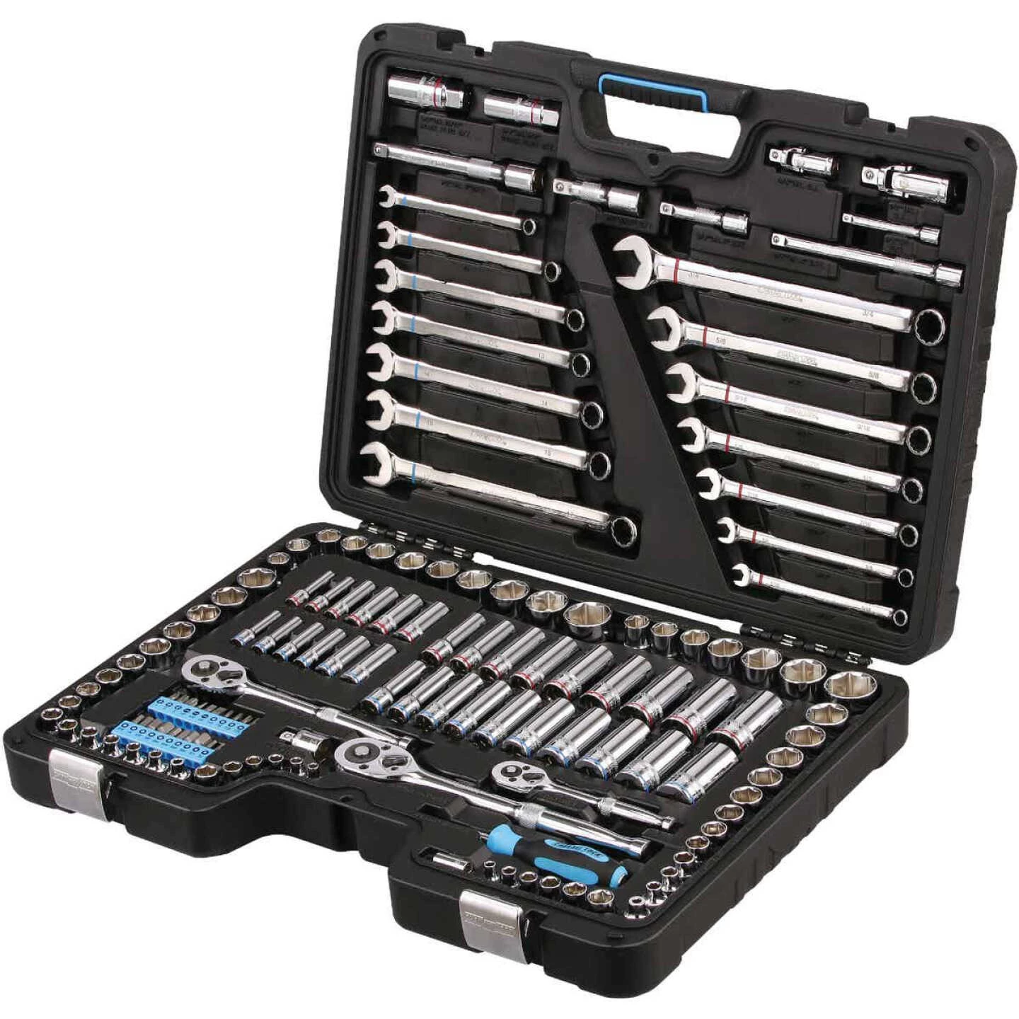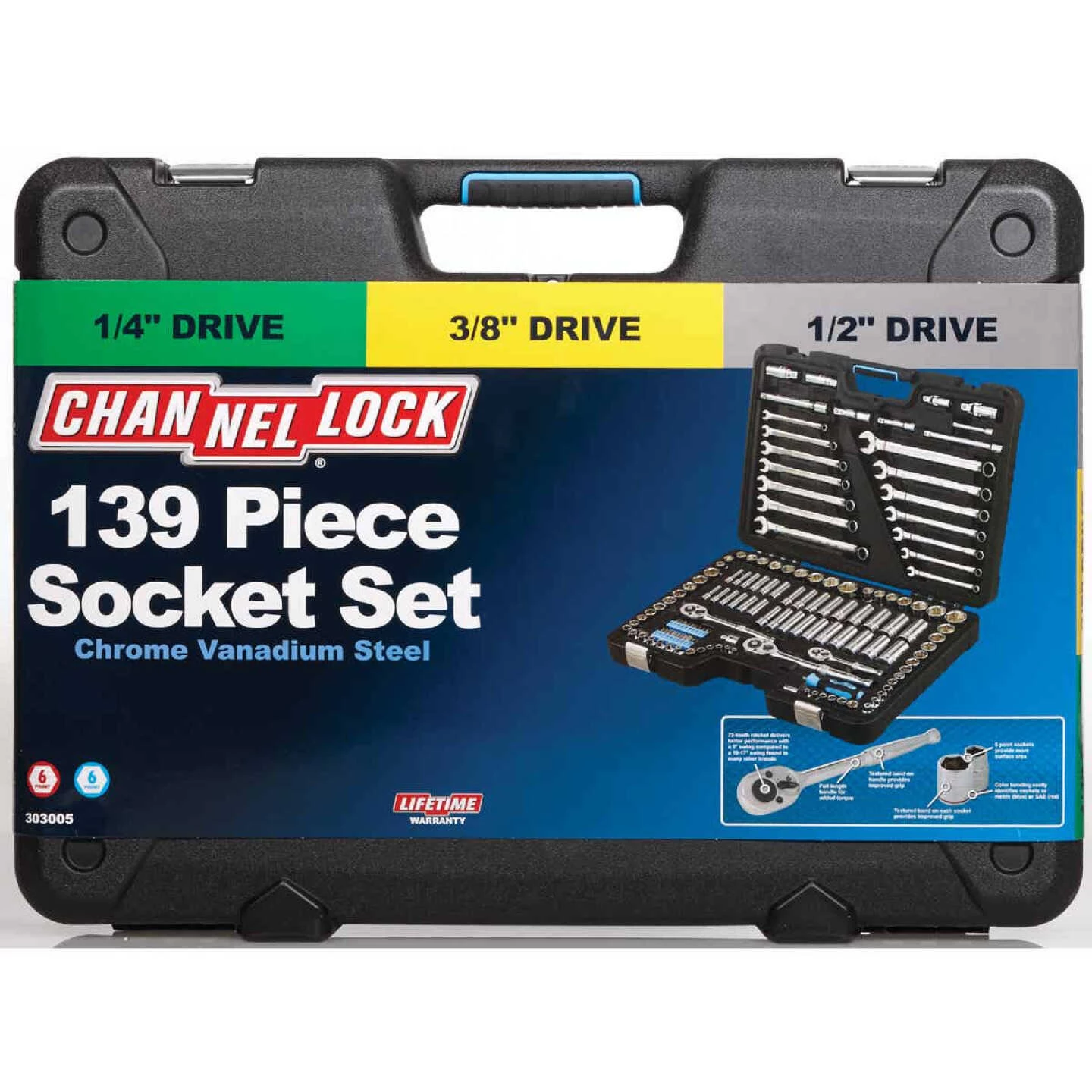 Multi-drive set. Color band denotes SAE/Metric measurement for easy identification. Textured bands offer improved grip. Chrome vanadium steel. Lifetime warranty. Set includes: 1/4″ drive 6-point sockets – 3/16″, 1/4″, 5/16″, 3/8″, 7/16″, 1/2″, 5mm, 6mm, 7mm, 8mm, 10mm, 12mm; 3/8″ drive 6-point sockets – 3/16″, 1/4″, 5/16″, 3/8″, 7/16″, 1/2″, 9/16″, 5/8″, 11/16″, 3/4″, 13/16″, 7/8″, 5mm 6mm, 7mm, 8mm, 9mm, 10mm, 11mm, 12mm, 13mm, 14mm, 15mm, 17mm, 18mm, 19mm, 21mm, 22mm; 1/2″ drive 6-point sockets – 1/2″, 9/16″, 5/8″, 3/4″, 7/8″, 1″, 1-1/8″, 12mm, 13mm, 14mm, 15mm, 17mm, 18mm, 19mm, 21mm, 22mm, 24mm, 27mm; 1/4″ drive 6-point deep sockets – 3/16″, 1/4″, 5/16″, 3/8″, 7/16″, 1/2″, 5mm, 6mm, 7mm, 8mm, 10mm, 12mm; 3/8″ drive 6-point deep sockets – 3/8″, 7/16″, 1/2″, 9/16″, 5/8″, 11/16″, 3/4″, 13/16″, 7/8″, 10mm, 11mm, 12mm, 13mm, 14mm, 15mm, 17mm, 18mm, 19mm, 22mm; 1/2″ F x 3/8″ M 1/2″ drive adapter; 3/8″ drive spark plug socket – 5/8″, 13/16″; 1/4″ drive extension – 3″; 3/8″ drive extension – 3″, 6″; 1/2″ drive extension – 3″, 6″; ratchet handles – 1/4″, 3/8″, 1/2″ drive; universal joints – 3/8″, 1/2″ drive; 1/4″ drive spinner handle; 1/4″ drive coupler; bits with holder – #1, #2, #3, 1/8″, 3/16″, 1/4″, SQ1, SQ2, T10, T15, T20, T25, 3/16″ hex, 1/4″ hex, 5/16″ hex, 3/8″ hex, 5mm, 6mm, 8mm, 10mm; combination wrenches – 5/16″, 3/8″, 7/16″, 1/2″, 9/16″, 5/8″, 3/4″, 8mm, 10mm, 12mm, 13mm, 14mm, 15mm, 17mm; hard carrying case.