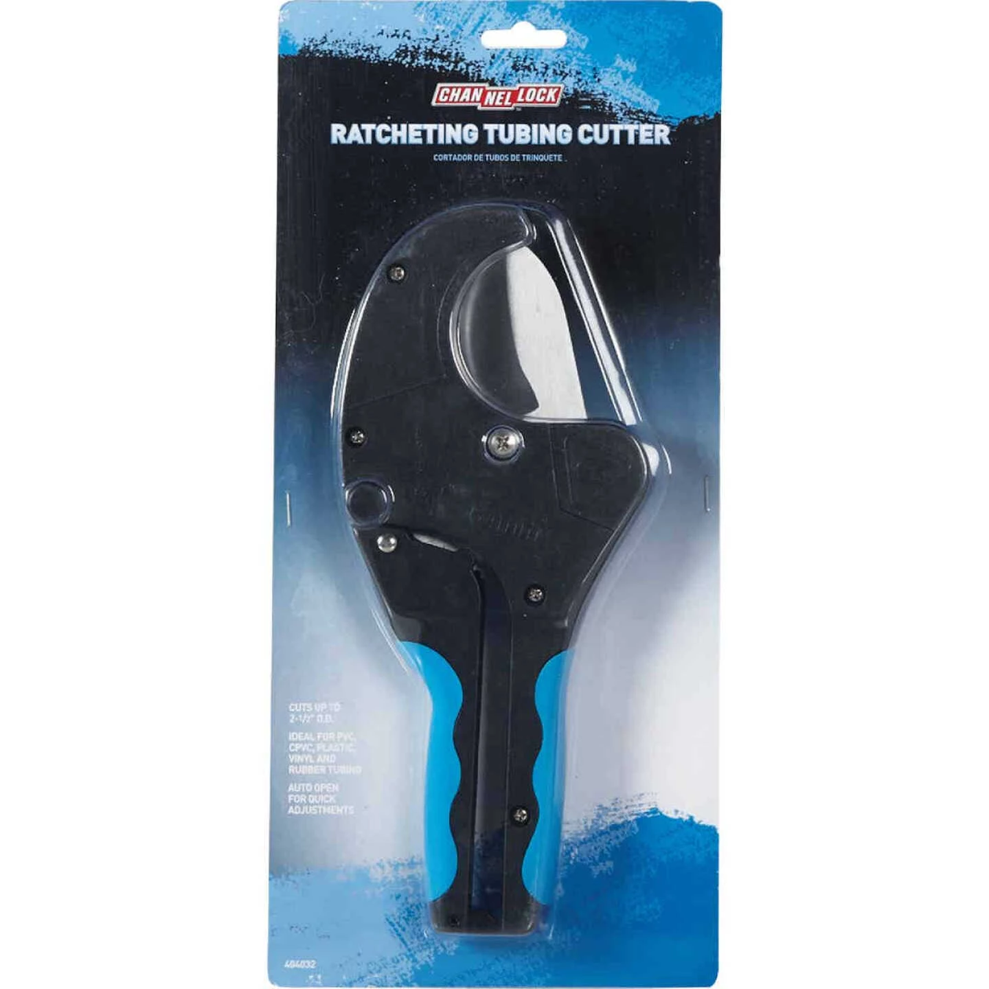Ratcheting tubing cutter. Auto open feature allows for single hand operation. Specifically designed stainless steel blade provides a smooth clean cut. Handles are equipped with rubber grips for added control.